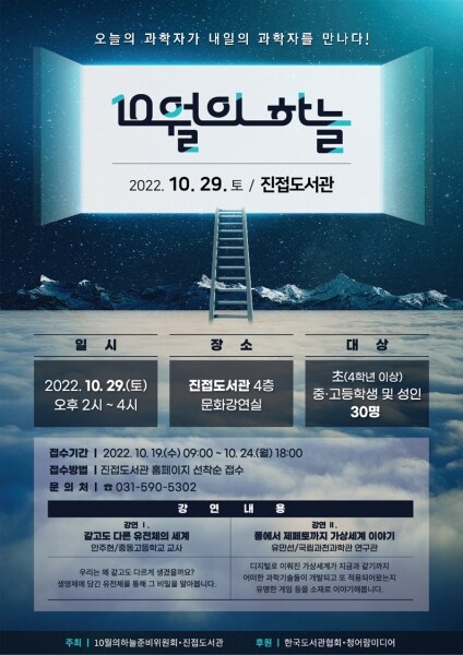 ‘10월의 하늘’은 매년 ‘오늘의 과학자가 내일의 과학자를 만나다’라는 슬로건 아래 10월 마지막 주 토요일 전국 50개의 공공 도서관에서 동시 개최되는 행사로 과학자들의 자발적인 재능 기부를 바탕으로 운영되는 나눔 강연회다.