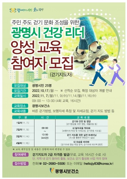 보건소 관계자는 “건강 리더는 지역주민이 스스로 이끄는 주민 주도형 걷기 동아리 등을 운영하며 걷기 실천을 활성화하는 역할을 할 것이다”며 “광명시에 일상 속 걷기로 건강생활을 실천하는 분위기가 확산되길 기대한다”고 밝혔다.