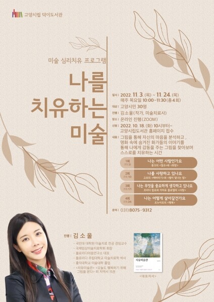 덕이도서관 관계자는 “내 마음을 어루만지는 특별한 그림을 찾아 떠나는 이번 강연이 힐링과 회복의 시간이 되었으면 한다”고 밝혔다.
