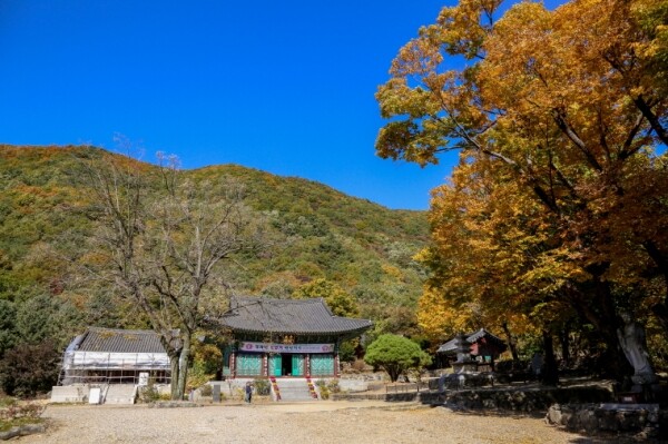 사나사계곡의 절 안팎에서 가을빛으로 물들어가는 노랗고 붉은 나무들은 나뭇잎을 흩뿌리며 탐방객들을 맞아준다.