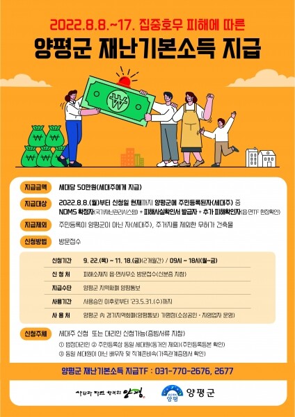 재난기본소득 신청은 피해 세대주 신청 원칙이며 읍·면사무소를 통해 오는 11월 18일까지 신청할 수 있으며 지급 대상은 지난 8월 8일부터 현재까지 양평에 주민등록이 되어있는 자 중 1)NDMS 확정자, 2)기존 피해사실확인서 발급자, 3)추가 피해확인자로 세대당 50만원씩 지역화폐로 지급된다.