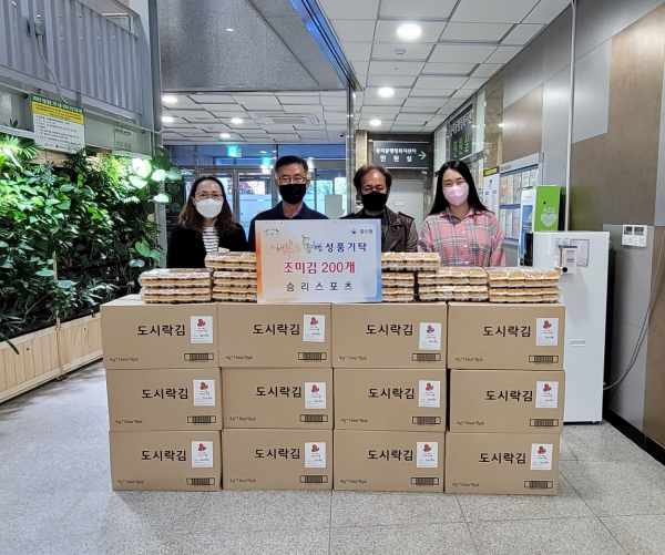 금번 기탁한 조미김은 저소득층 및 복지사각지대 주민의 식생활에 도움이 되고자 기탁한 것으로 승리스포츠는 중리동뿐 아니라 관내 여러 읍면동의 어려운 이웃을 위한 나눔활동을 꾸준히 실천하고 있다.
