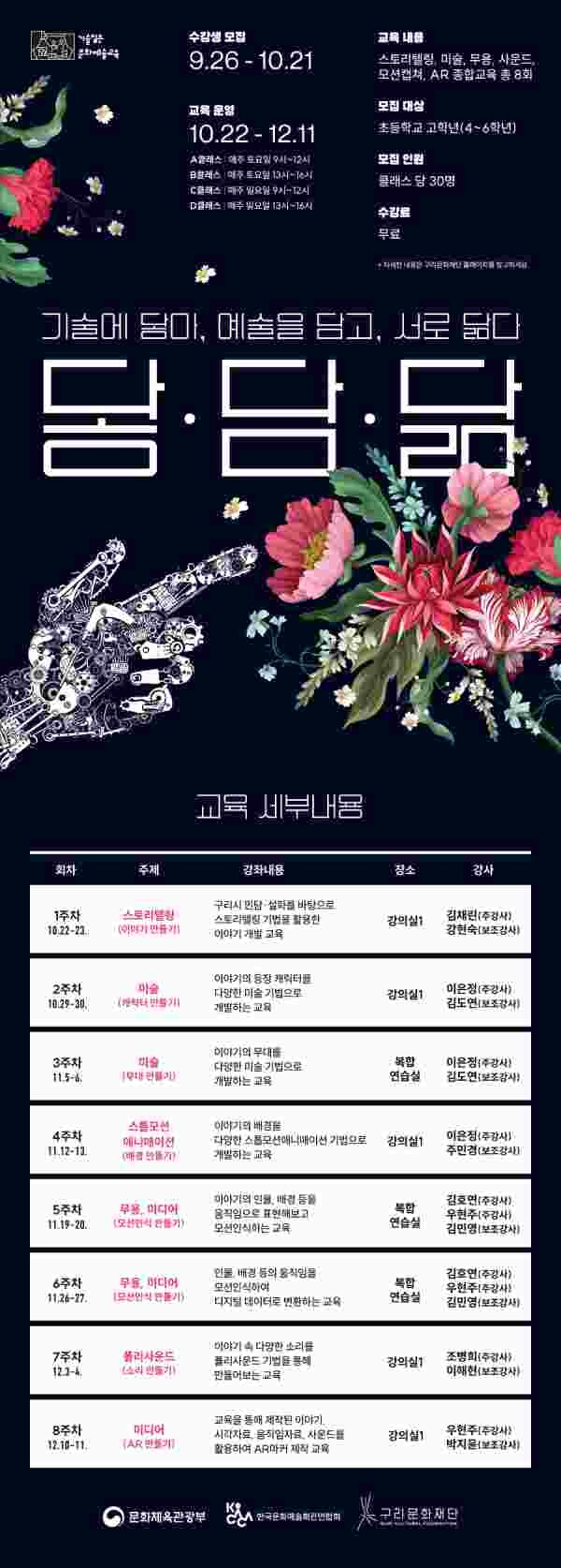 문화체육관광부와 한국문화예술회관연합회 그리고 구리문화재단이 함께 추진하는 이번 강좌는 10월 22일부터 12월 11일까지 매주 토요일과 일요일에 4기수로 나누어 각 8회차씩 운영된다.