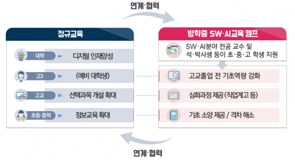 학교·대학·민간 등 다양한 주체가 정규교과와 연계된 교육내용을 구성해, 학생들의 발달 단계에 맞는 놀이·체험 활동 중심의 절차적 문제해결, 프로젝트 기반 공동학습 및 코딩 실습 등의 소프트웨어·인공지능 교육을 제공하고 캠프 운영과정에서 정보교사 등 현직교원들과 교·사대 예비교원이 강사로 참여함으로써 학교 현장에 소프트웨어·인공지능 교육 역량이 축적될 수 있도록 지원할 계획이라고 전했다.
