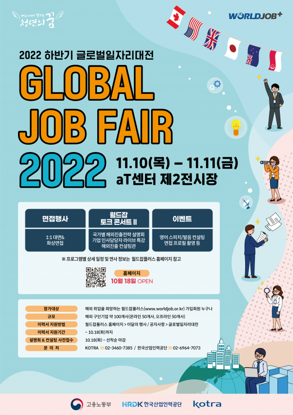 이번 행사는 11월 10일~11일 서울 aT센터에서 열리는 국내 최대규모 해외취업 박람회인 ‘2022 하반기 글로벌일자리대전’과 동시 개최되며 국가별·기업별 설명회와 컨설팅 부스 운영 등으로 박람회를 더욱 다채롭게 채울 예정이다.