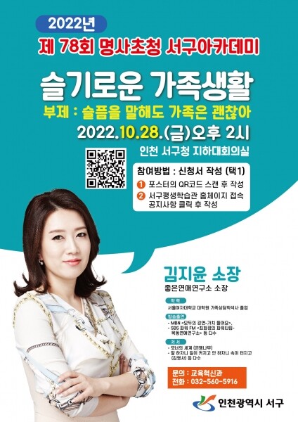 ‘명사초청 서구아카데미’는 인천시민이면 누구나 참석할 수 있으며 서구 평생학습관 홈페이지를 통해 사전 참여 신청을 하면 된다.