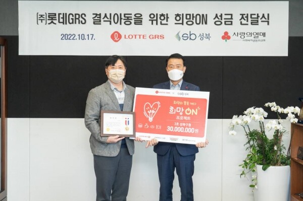 롯데GRS 마케팅부문 이원택 상무와 성북구 이승로 구청장이 참석해 ‘희망 ON’ 기금과 기부에 감사를 표하는 감사장 전달식을 지난 17일에 진행했으며 이승로 성북구청장은 차기 기부처로 중랑구청을 지목했다.