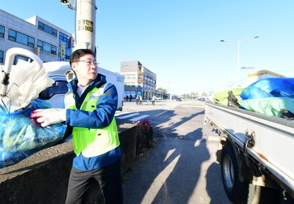 19일 정 시장은 쾌적한 도시환경을 위해 일하는 환경미화원 3명과 함께 마도 농협에서 시작해 재래시장까지 3㎞ 구간을 쓸고 생활폐기물 4톤을 수거했다.