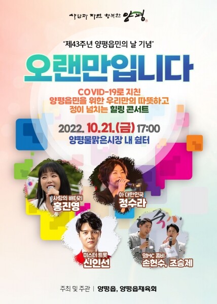 1부와 2부로 나누어 진행될 양평읍민의 날 행사는 군정발전에 노력한 지역주민 표창과 다채로운 문화공연이 준비돼 있으며 홍진영·정수라·신인선 등 가수들이 출연해 흥겨운 무대를 선보일 예정이다.