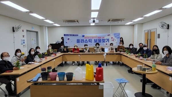 이번 활동은 광교노인복지관에서 이루어졌으며 성인봉사자 30명과 플라스틱 업사이클 전문업체 동네형 이종영 대표가 참여했으며 기후위기와 자원순환 교육을 진행한 뒤 플라스틱 업사이클 기계를 통해 직접 플라스틱 업사이클 화분을 만들어보는 시간을 가졌다.