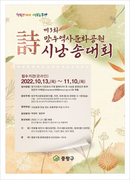 초등부와 일반부로 나눠 진행되며 망우역사문화공원의 인물, 자연, 유래 등과 관련된 시 1편을 암송한 영상을 이메일로 제출하면 된다.