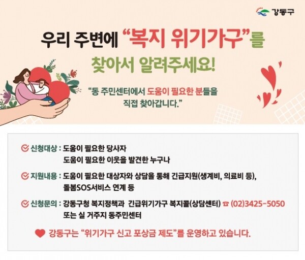 이와 함께, 카카오톡 채널 ‘강동구 위기가구 긴급 복지콜 상담센터’를 통해서도 쉽게 복지 상담을 받을 수 있다.