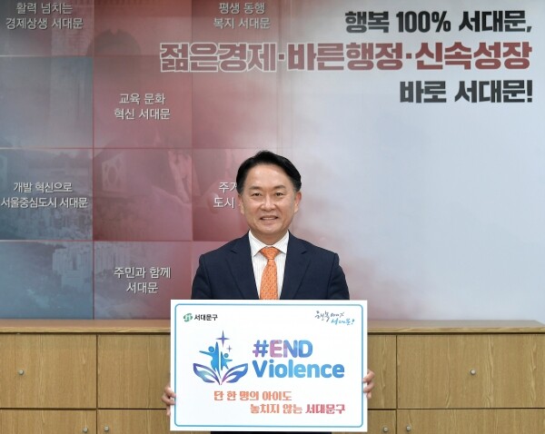 이 구청장은 이날 집무실에서 자신의 SNS에 게시하기 위해 #END Violence, 캠페인 로고 ‘단 한 명의 아이도 놓치지 않는 서대문구’란 글이 담긴 손팻말을 들고 사진을 찍었다.