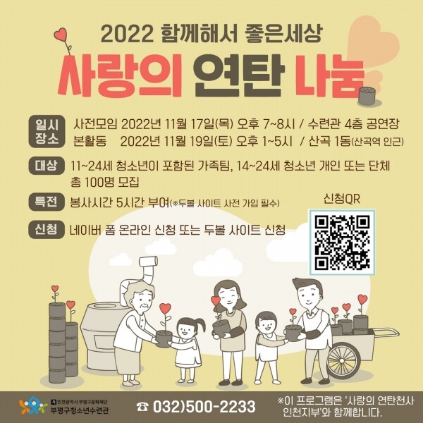 이번 봉사활동은 지난해에 이어 두 번째로 진행하는 연탄 나눔 봉사활동으로 오는 11월 19일 산곡1동 연탄 사용 가정에 청소년과 가족이 함께 4천여 장의 연탄을 배달할 예정이다.