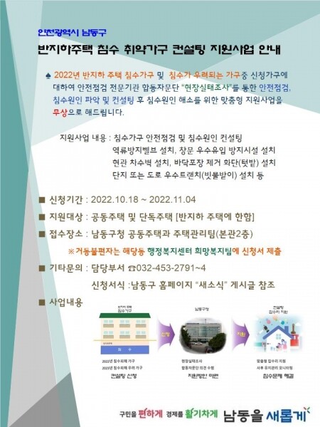 자세한 사항은 남동구청 공동주택과 주택관리팀 또는 남동구청 홈페이지 새소식란에서 확인할 수 있다.