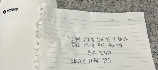 날씨가 추워지는 만큼 도움이 필요한 이웃을 지원하는 데 쓰이기를 바란다”고 말하며 정성스레 모은 기부금 봉투를 면사무소에 전달했다.
