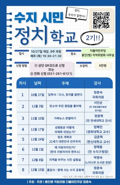 정 의원은 “수지시민정치학교 2기를 통해 수지 주민 여러분께서 정치 현안에 대해 소통하고 더 나은 지역 사회를 토론하는 자리가 되길 바란다”고 했다.