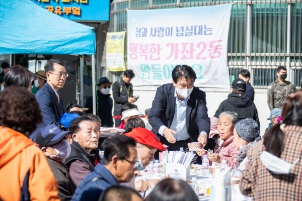 가좌2동도 동 행정복지센터 앞마당에서 잔치를 진행하며 음식을 대접하고 무대를 설치해 축하공연을 펼쳤다.