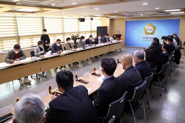 이날 간담회에는 도시환경위원회 소속 위원 9명과 수원시 생활폐기물 수집·운반 대행업체 대표 13명, 수원시 환경국장 등이 참석한 가운데 생활폐기물 수거 관련 민원사항을 전달하고 대행업체의 의견 및 애로사항을 청취했다.