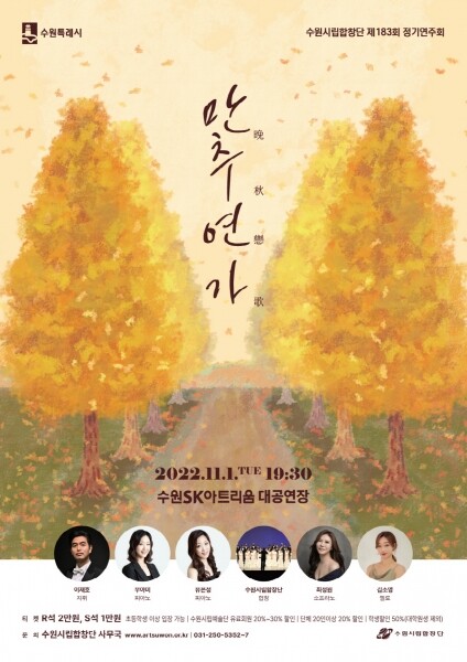 이재호 지휘자의 섬세한 지휘와 수원시립합창단의 가을 감성 물씬 풍기는 완벽한 하모니로 깊은 감동의 무대를 선사할 수원시립합창단 제183회 정기연주회 ‘만추연가’의 티켓 가격은 R석 2만원, S석 1만원이며 초등학생부터 관람가능하다.