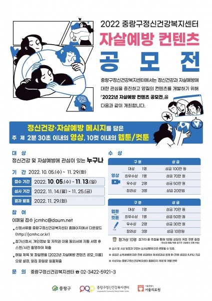 류경기 중랑구청장은 “정신건강과 자살예방의 중요성은 아무리 강조해도 지나치지 않다”며 “많은 이들의 마음을 토닥이고 생명의 소중함을 알릴 수 있는 위로와 희망의 메시지를 영상과 웹툰으로 마음껏 표현해 주시길 바란다”고 참여를 독려했다.