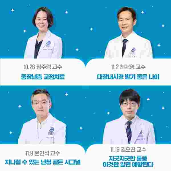 이번 프로그램은 정주령 치과교정과 전문의의 ‘중장년층의 구강건강 관리 및 교정치료’ 강의를 시작으로 천재영 소화기내과 전문의 ‘소화기 질환 진단 및 대장내시경 받기 좋은 나이’ 문인석 이비인후과 전문의 ‘지나칠 수 있는 난청 골든 시그널’ 권오찬 류마티스내과 전문의 ‘지긋지긋한 통풍, 이것만 알면 예방한다’로 총 4회에 걸친 강연 형식으로 진행된다.
