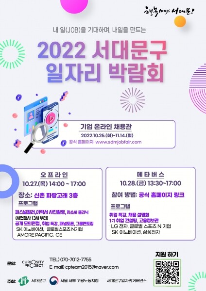 또한 이달 27일 오후 2∼5시에는 신촌 파랑고래 3층에서 그 다음 날인 28일 오후 1시 30분∼5시에는 메타버스 사이트에서 취업 컨설팅이 열린다.