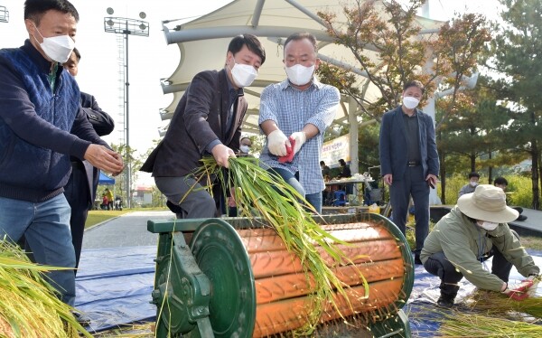 참여자들은 지난 6월에 모내기한 토종 벼를 직접 추수하고 수동탈곡기를 이용한 전통 탈곡방식을 체험했다.
