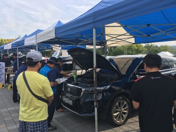 카포스 정비사 150명이 이날 성남시청 주차장을 찾아오는 시민 차량의 엔진룸, 브레이크 패드와 라이닝, 배터리, 타이어 각종 부품 상태를 점검해 준다.