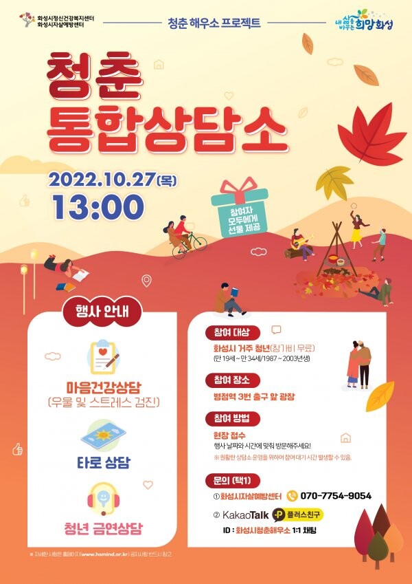 청춘통합상담소와 관련한 문의는 화성시자살예방센터 또는 카카오톡 플러스 친구 ID ‘화성시청춘해우소’로 문의하면 된다.