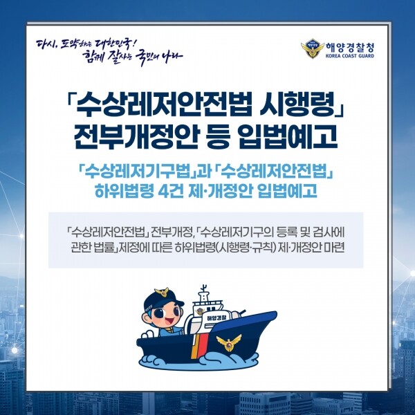 하위법령 제·개정안은 해양경찰청 누리집 또는 국민참여입법센터에서 확인할 수 있으며 입법예고 기간 동안 제출되는 의견들을 수렴해 향후 법제처 심사 등을 진행하고 법률 시행일에 맞춰 제·개정안을 공포할 예정이다.