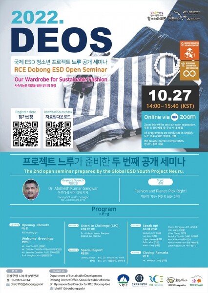 또한 RCE 스리나가르의 아부다쉬 쿠머 강워 박사의 ‘패션과 지구-당장의 옳은 선택’ 기조강연 도봉구-유네스코한구위원회-한국외대 공동 연구 ‘ESD 과정 개발 운영’의 지역연계형 ESD 파일럿팀 특별발표 ‘지속가능한 패션을 위한 우리의 옷장’에 대한 느루 참여 학생 12명의 ‘목소리를 높여요’ 등이 진행된다.