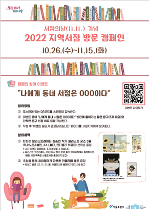 이벤트는 “나에게 동네 서점은 000이다” 빈칸 채우기로 참여한 시민 중 300명을 별도 추첨해 음료 세트 모바일 상품권도 지급한다.