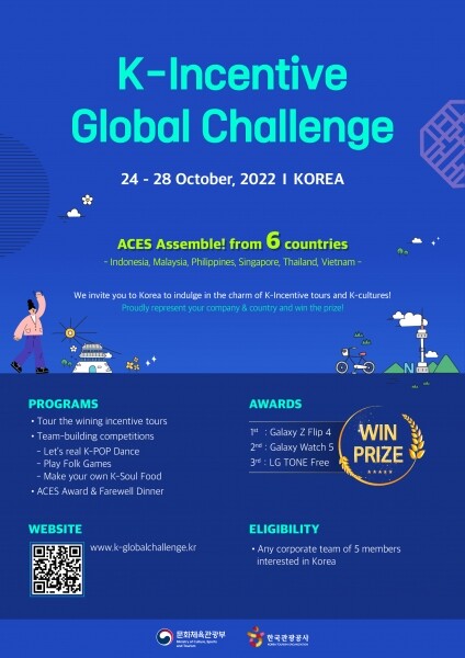 10월 27일~28일 서울에서 열리는 이 대회는 문화체육관광부와 한국관광공사가 동남아의 방한 인센티브·기업회의 단체 주요 6개국에서 국가별 5명씩 총 30을 초청해 실시하는 ‘K-인센티브 글로벌 챌린지 대회’다.