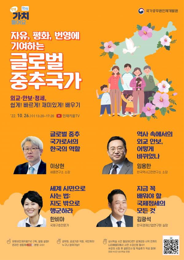 국가공무원인재개발원은 26일 ‘외교·안보 정세 정책편, 쉽게 빠르게 재미있게 배우기’를 주제로 ‘온세상 지식탐구생활, 안녕 가치 들어요' 공개강좌를 개최한다고 25일 밝혔다.
