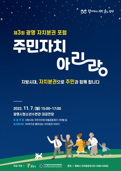 광명 자치분권 포럼 ‘주민자치 아리랑’은 시민, 주민자치회 위원, 전문가 등이 한자리에 모여 자치분권에 대해 이야기를 나누는 공론의 장으로 2019년과 2021년에 이어 올해 세 번째이다.