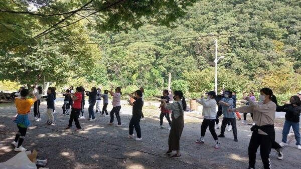 이번 야외 수업은 초월읍 도평리 인근에서 줌바댄스 프로그램 수강생 30여명을 대상으로 진행했으며 야외 마스크 착용 의무 해제 이후 첫 야외 수업으로 힐링 프로그램을 진행함에 따라 수강생들의 높은 호응을 얻었다.
