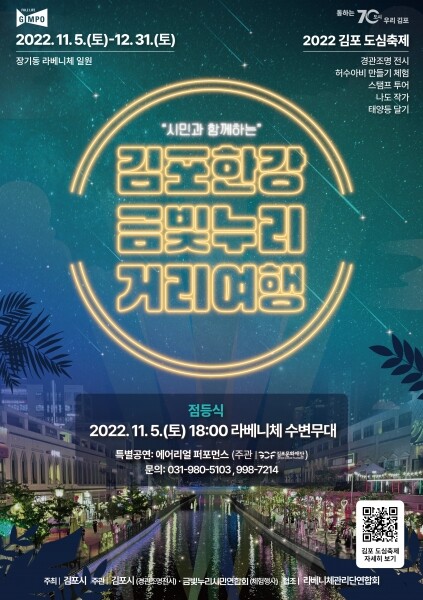 이 축제는 ‘김포시민과 함께 하는 김포한강 금빛누리 거리여행’라는 주제로 현장 일대 관광 활성화를 유도하기 위해 기획된 것으로 화려한 경관조명을 비롯해 빛 조형물 등이 설치될 예정이다.