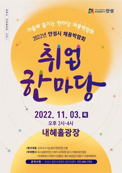 김보라 안성시장은 “이번에 개최하는 채용박람회가 취업 빈곤 시대의 구인구직 난을 해결할 단초가 될 뿐만 아니라 지속 가능한 실질적인 일자리 복지 제공에 기여하길 바란다”며 “참여하는 모든 시민에게 즐겁고 유익한 시간이 되길 바란다”고 전했다.