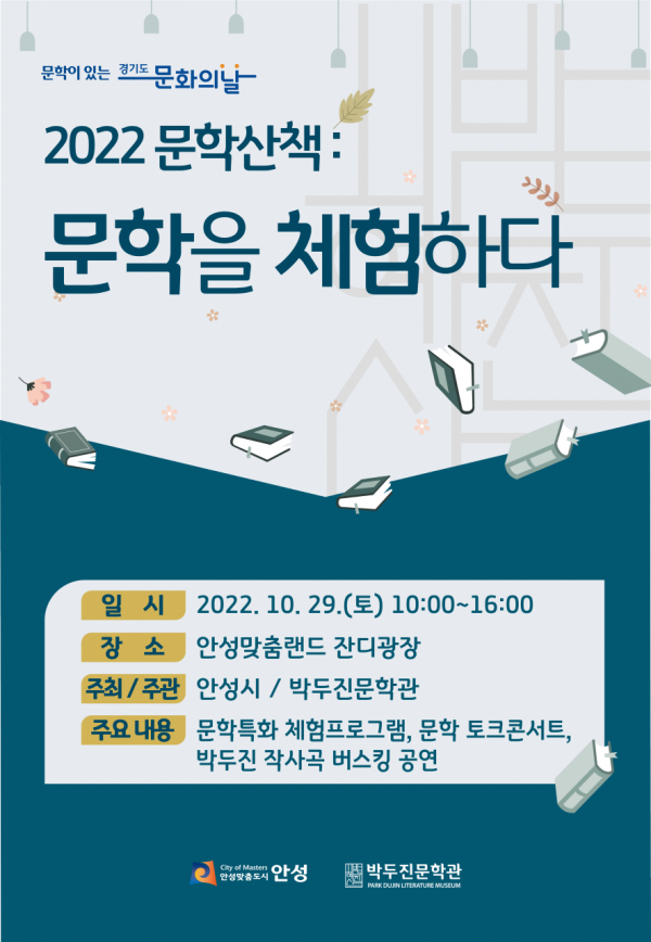 이번 ‘2022 문학산책: 문학을 체험하다’는 안성맞춤랜드 잔디광장에서 진행되며 안성 시민 모두가 즐길 수 있도록 문학 체험부스와 문학 토크콘서트, 올해의 안성문인을 소개하는 이동 전시 등 다양한 볼거리와 체험 활동을 제공한다.