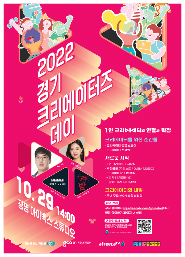 행사장에 직접 오지 못하더라도 10월 29일 오후 2시부터 ‘경기도 1인 크리에이터’ 공식 유튜브 채널과 아프리카tv를 통해 실시간으로 시청할 수 있다.