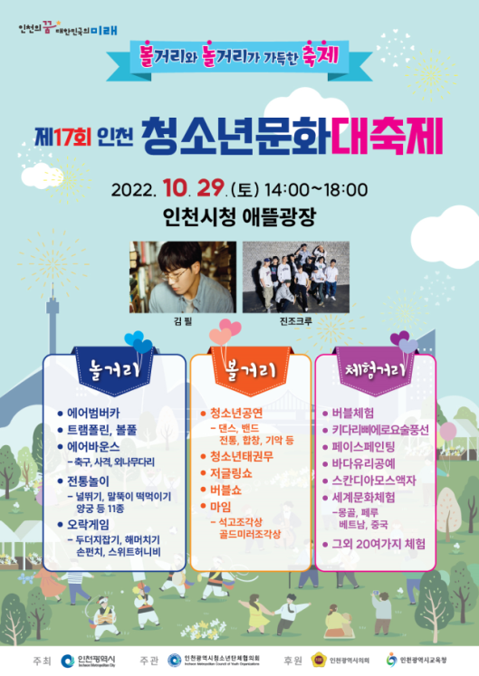 ‘인천 청소년 문화대축제’는 청소년들의 문화적 역량을 한 자리에 모아 펼침으로써 건전한 청소년 문화를 확립·보급하고 청소년문화에 대한 시민의 이해와 관심을 높이기 위한 대표적인 청소년 행사로 올해로 17회째를 맞는다.