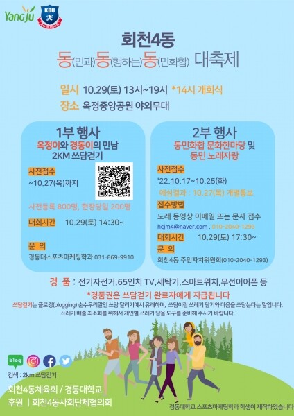 1부는 기후변화와 장기간의 코로나19로 지친 동민들에게‘쓰레기를 줍다’와‘마음을 쓰담는다’중의적인 표현을 담아 ‘2km 쓰담걷기’라는 테마로 진행되는 체육행사로 다양한 연령이 참여하는 걷기행사와 각종 공연과 경품행사 등 경동대학교 양주캠퍼스 스포츠마케팅 학과와 협업으로 진행될 예정이다.