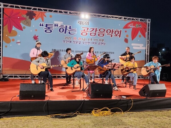 이번 음악회는 남촌동 주민자치회 주관으로 코로나19로 지친 시민들에게 휴식의 시간을 제공하기 위해 마련됐으며 남촌동 행정복지센터 문화강좌 수강생과 오산 통기타 연합회 동아리 재능기부를 통해 공연이 진행됐다.