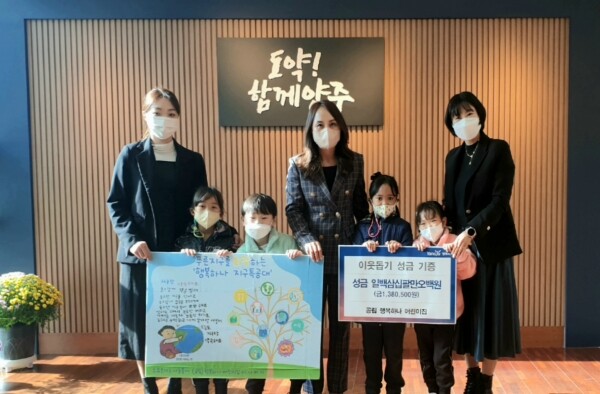 이날 전달식에는 송미애 양주2동장과 행복하나 어린이집 원장선생님, 담당선생님, 원아 4명이 참석했다.