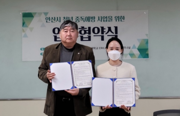 한양대학교 ERICA캠퍼스 학생회관에서 진행된 협약식은 정사임 중독관리통합지원센터 센터장과 서동호 한양대학교 ERICA 사회봉사팀장 등이 참석한 가운데 진행됐다.