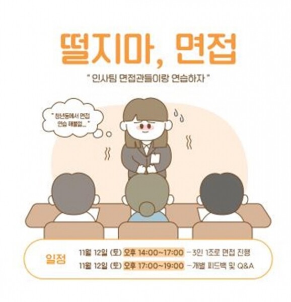 ‘떨지마, 면접’은 면접불안에 떨고 있는 청년들을 위해 기업 인사 담당자가 실제 기업 면접과 같이 진행하고 청년들에게 피드백을 주는 방식으로 진행된다.
