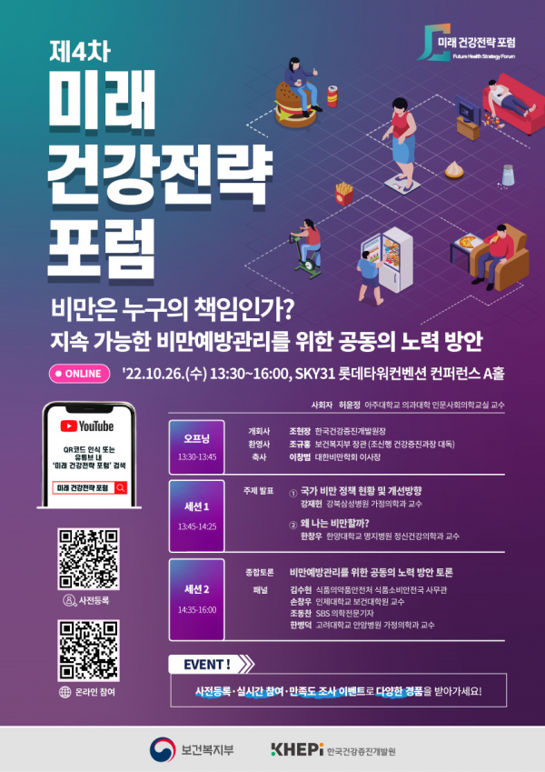 한국건강증진개발원 조현장 원장은 “코로나19로 인한 국민 건강행태 변화로 비만율이 전반적으로 높아졌고 이로 인해 만성질환 증가 등 국민 건강이 더욱 악화될 가능성이 있다”고 설명하며 “이번 토론이 실효성 있는 비만 예방·관리 정책의 방향성에 대한 발전적인 논의의 장이 되기를 기대한다”고 밝혔다.