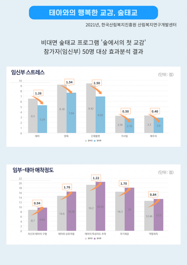 그리고 지난해 임신부 대상 비대면 숲태교 프로그램의 효과를 분석한 바에 의하면, 임신부들의 스트레스가 감소하고 태아 애착 정도가 증가한 것으로 나타났다.