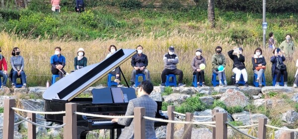 무대 앞에 관람자용 캠핑의자 100여개를 배치해 누구나 양재천을 걷다 잠시 앉아서 공연을 즐길 수 있다.